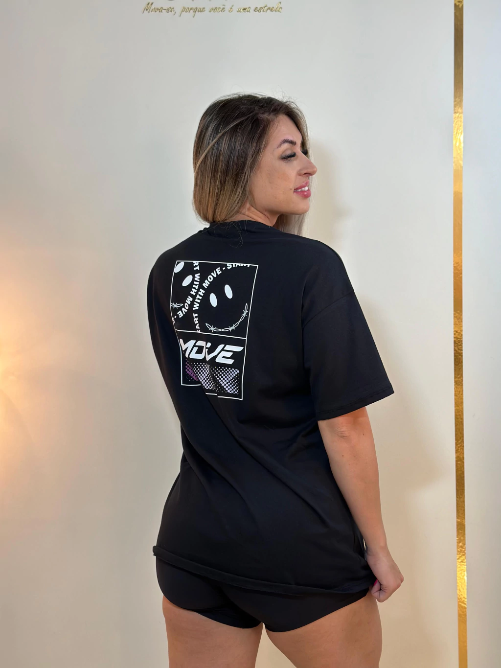 O caimento é mais soltinho, trazendo aquela vibe street confortável e atual. A estampa “BE HAPPY – MOVE” mistura tipografia marcante com um smile estilizado, criando um visual jovem, leve e cheio de energia positiva.